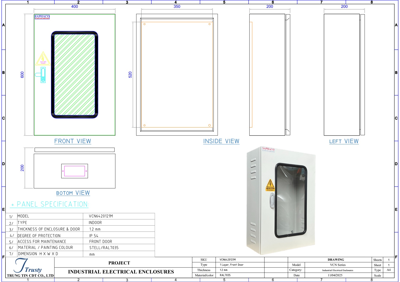 | Vỏ tủ điện | IP54, Không Mica, Kích thước (mm): H600xW400, Một lớp cửa, Thép sơn tĩnh điện, Trong nhà |
